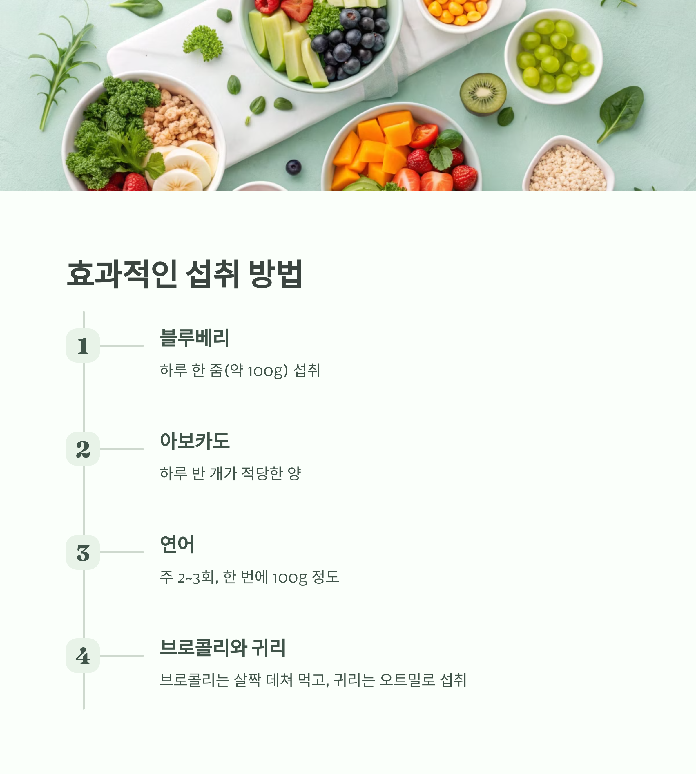 블루베리: 하루 한 줌(50~70g) 아보카도: 하루 반 개(100g) 두부: 하루 반 모(150~200g) 호두: 하루 4~5알(30g) 고구마: 하루 150~300g 연어: 주 2~3회, 100~150g 브로콜리: 하루 100~150g 귀리: 하루 30~50g 달걀: 하루 1~2개 마늘: 하루 1~2쪽(5~10g)