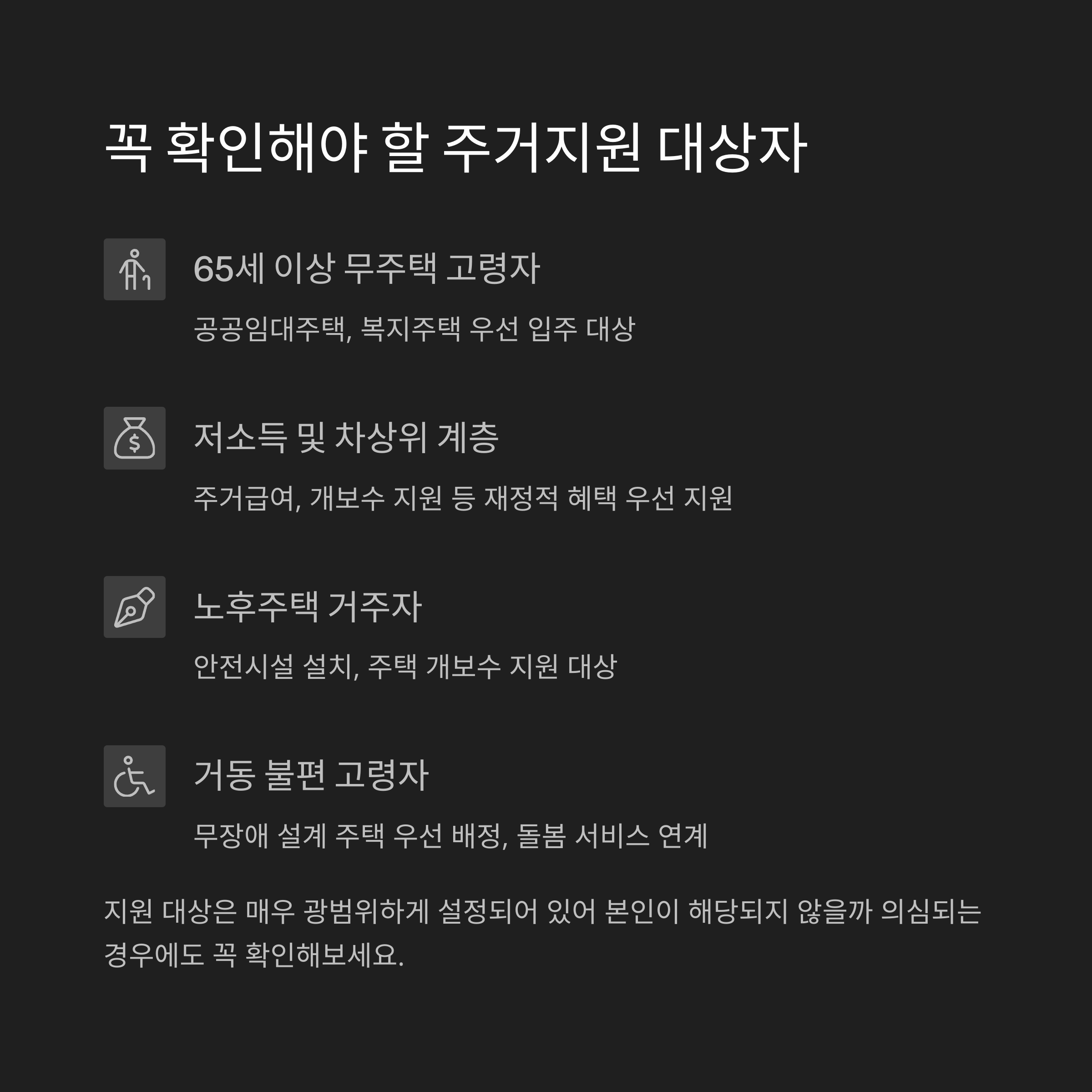 고령자 주거지원 정책을 활용해 안정된 주거 생활을 느껴보세요. 여러분의 작은 실천이 보다 나은 생활을 실현해줄 것입니다. 나 자신과 가족의 안녕을 위해 꼭 필요한 부분들을 체크하고 준비하세요.